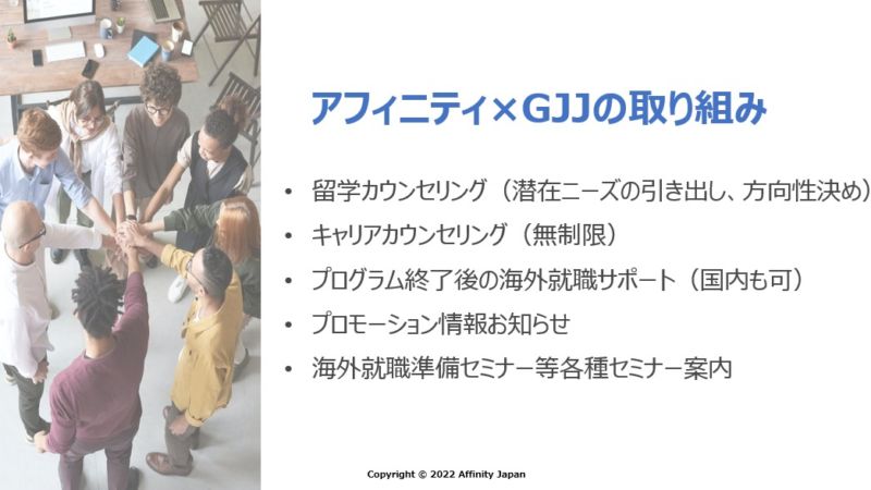 アフィニティでは、GJJ海外就職デスク(運営:GJJ株式会社、本社:東京都新宿区、代表:⽥村 貴志)と共に海外就職⽀援プログラムを提供しており、皆さん1人1人のキャリア支援に力を入れています。