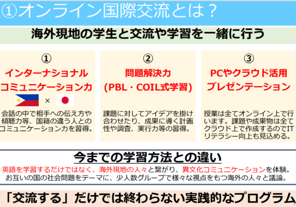 留学の形もコロナ前とは大きく異なってきています。 今回のセミナーの中では語学学習&国際交流の一つとしてCURIOUS WORLD さんのオンライン留学プログラムもご紹介させていただきました。 語学だけでなく、海外現地の学生と交流しながら学習を行えることがプログラムの大きな特徴で、現地学生との交流の中でインターナショナルなコミュニケーション力を培うこともオンライン留学の目的の一つです。