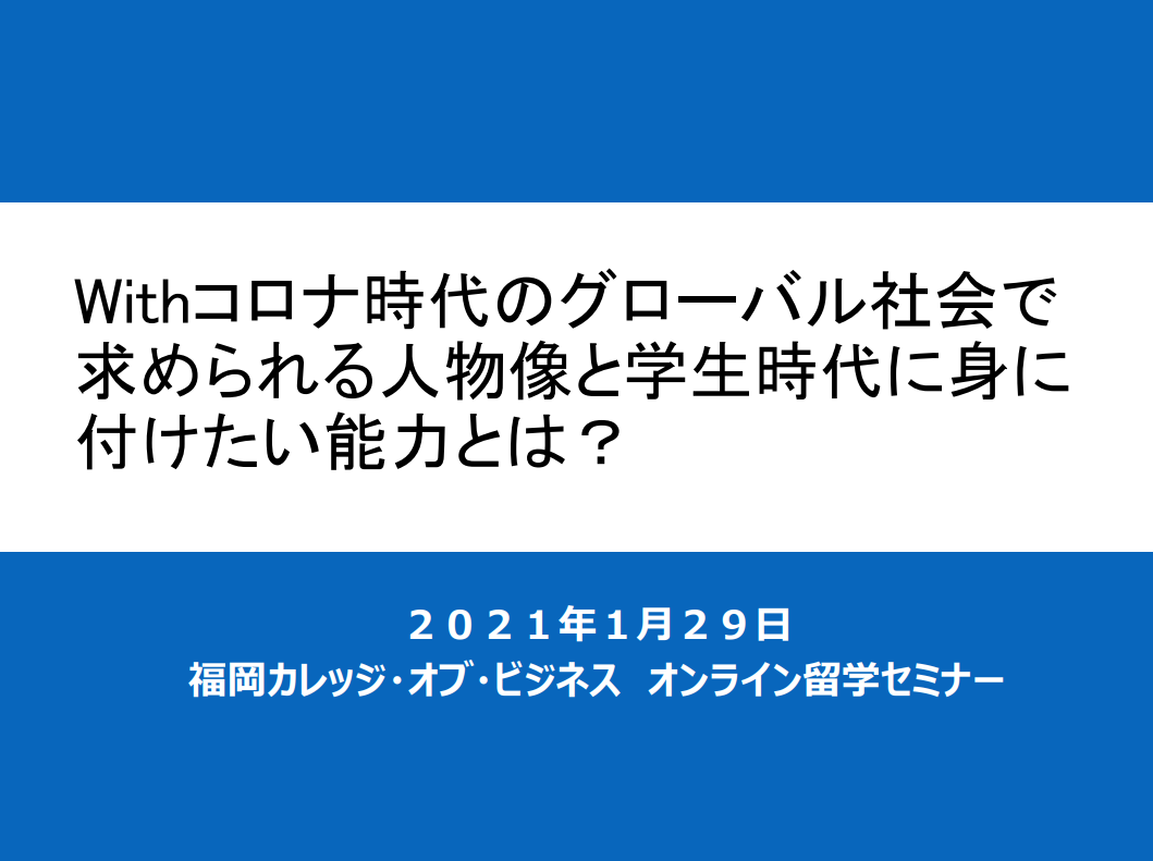 2021年1月29日(金)福岡カレッジ・オブ・ビジネスにてオンライン留学セミナーを行いました。 コロナ禍の今、留学出来る国が限られています。 コロナ収束後、どの国へも自由に留学出来るようになる前に、今出来る英語学習や国際交流が何かないものかと学校様からご相談を頂くことも増えて参りました。