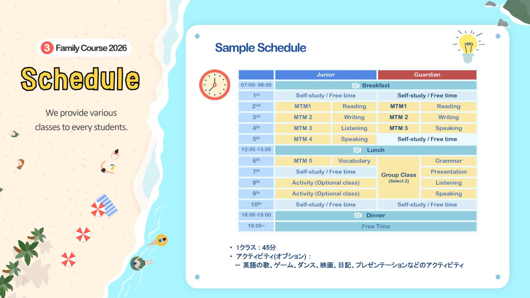 | コース 内容 | お子様:マンツーマンレッスン5コマ+アクティビティ2コマ(オプション) 保護者様:マンツーマン3コマ+グループレッスン2コマ *1コマ=45分 |