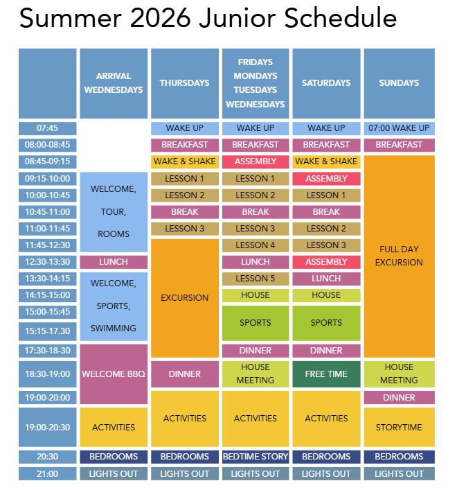 | コース 内容 | <8-11歳> 週19.5時間の英語、数学、科学、アーツなどのレッスン+アクティビティ、遠足 <12-17歳> 週22.5時間の英語、数学、科学、地理、アート、ICTなどのレッスン+アクティビティ+遠足 |