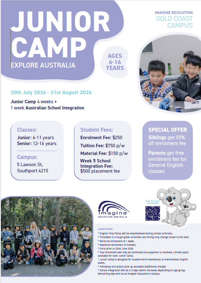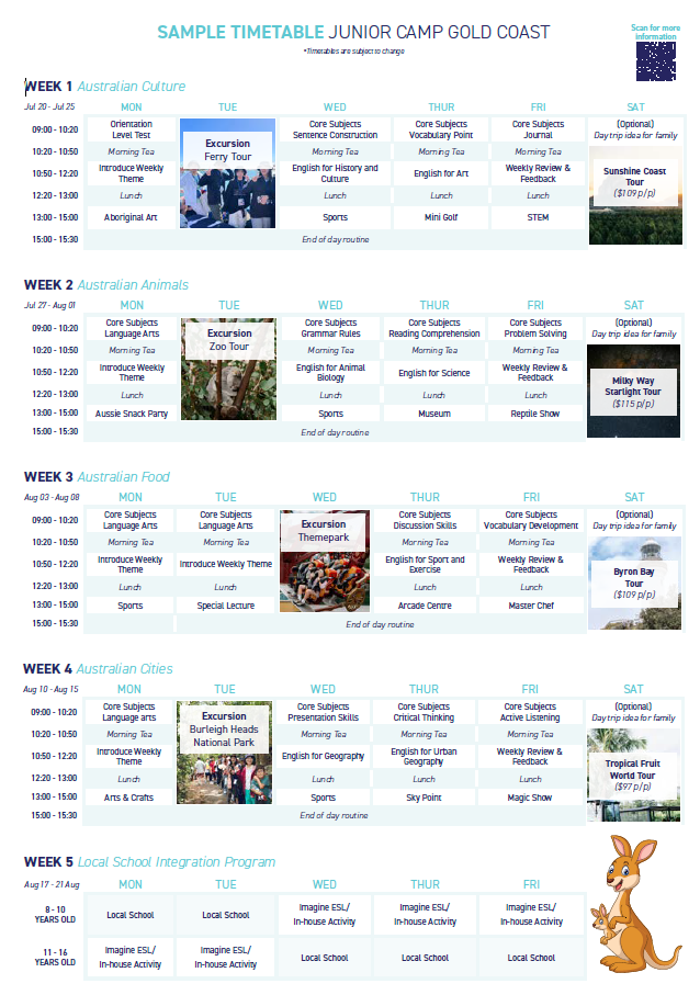 | 2026年サマー日程:ゴールドコースト⇒2026年7月20日~8月21日(全5週間*最終週は現地校体験) ブリスベン⇒2026年7月20日~8月14日(全4週間) *夏休み・冬休み・春休みの年間3回の実施 | |