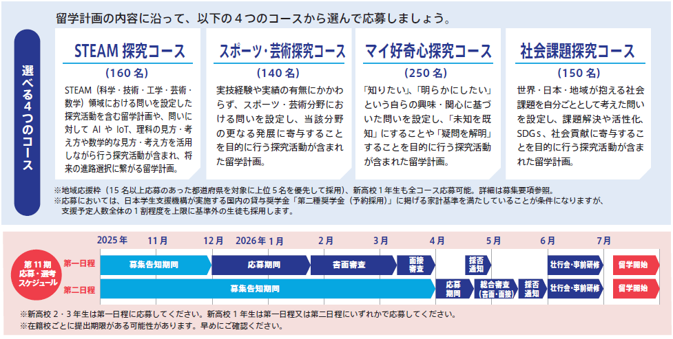 また、自ら留学計画を立案、計画、実行することで、「社会にイノベーションを起こすグローバル探求リーダー」として活躍する人材になってほしいという期待が込められています