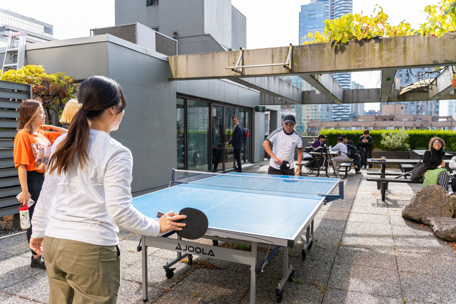 屋上には開放的なパティオがあり、学生の交流の場となっています。暖かい日はパティオで授業しているクラスもあります。
